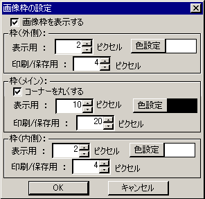画像の回りに3色の枠を設定できます。枠は、単に表示だけでなく、印刷や保存画像にも有効です。