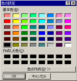 「色設定」ボタンを押すと上記のような「色の設定」ダイアログが表示されますので、好きな色を選択して下さい。「色の作成」ボタンを押して、さらに細かい色の指定をすることも可能です。